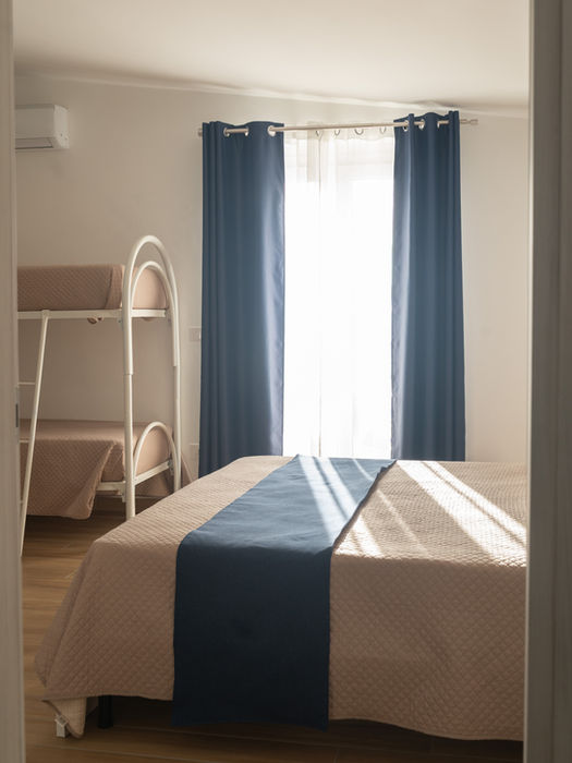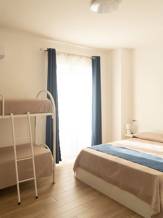 La Camera Mare, al primo piano, è pensata per chi cerca più spazio durante la vacanza. Con quattro posti letto e balconcino privato, permette di vivere momenti all’aperto e godersi l’atmosfera in totale relax.